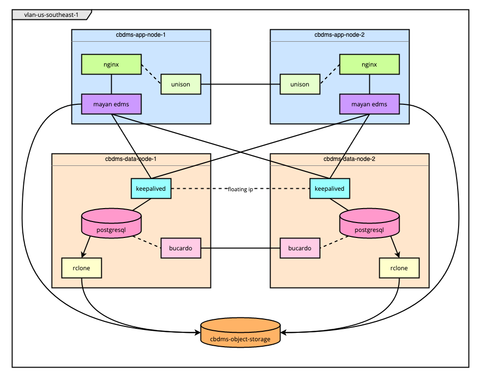 10.8.0.100). The floating URL is maintained bykeepalivedconfigured for failover.Mayan stores its documents in a Linode Object Storage bucket created for that purpose.